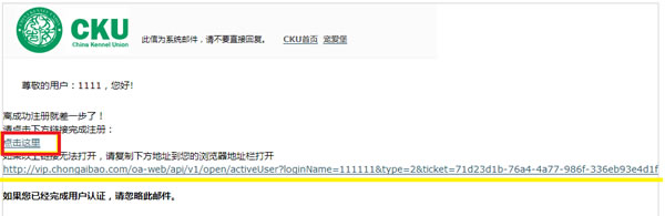 登录邮箱,打开邮件,如图,如点击红色框里内容无法打开网页,则复制下方黄色线划出的网址到IE浏览器里打开即可完成注册。